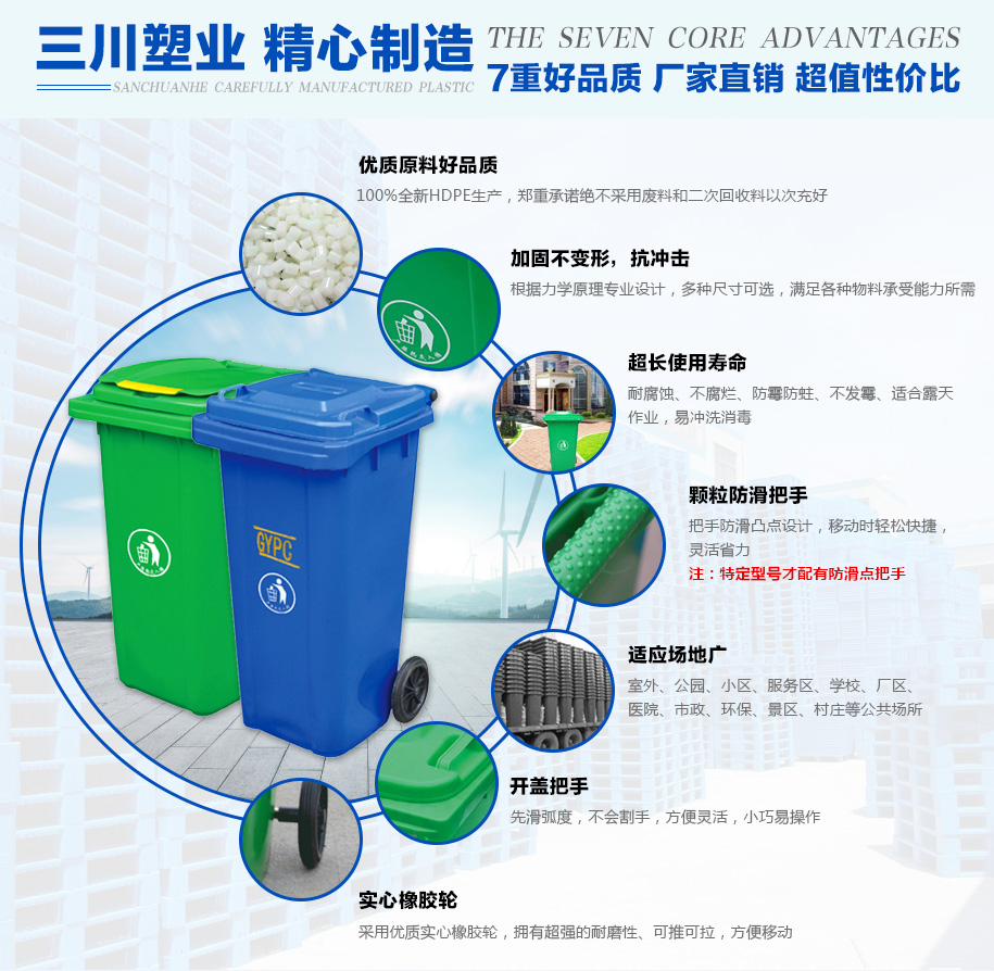 4、每只垃圾桶均裝有輪胎,您無需再行購置小垃圾車,更節(jié)省費(fèi)用。